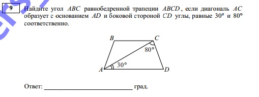 Найдите угол ABC равнобедренной трапеции ABCD, если диагональ AC образует с основанием AD и боковой стороной CD углы, равные 30° и 80° соответственно.