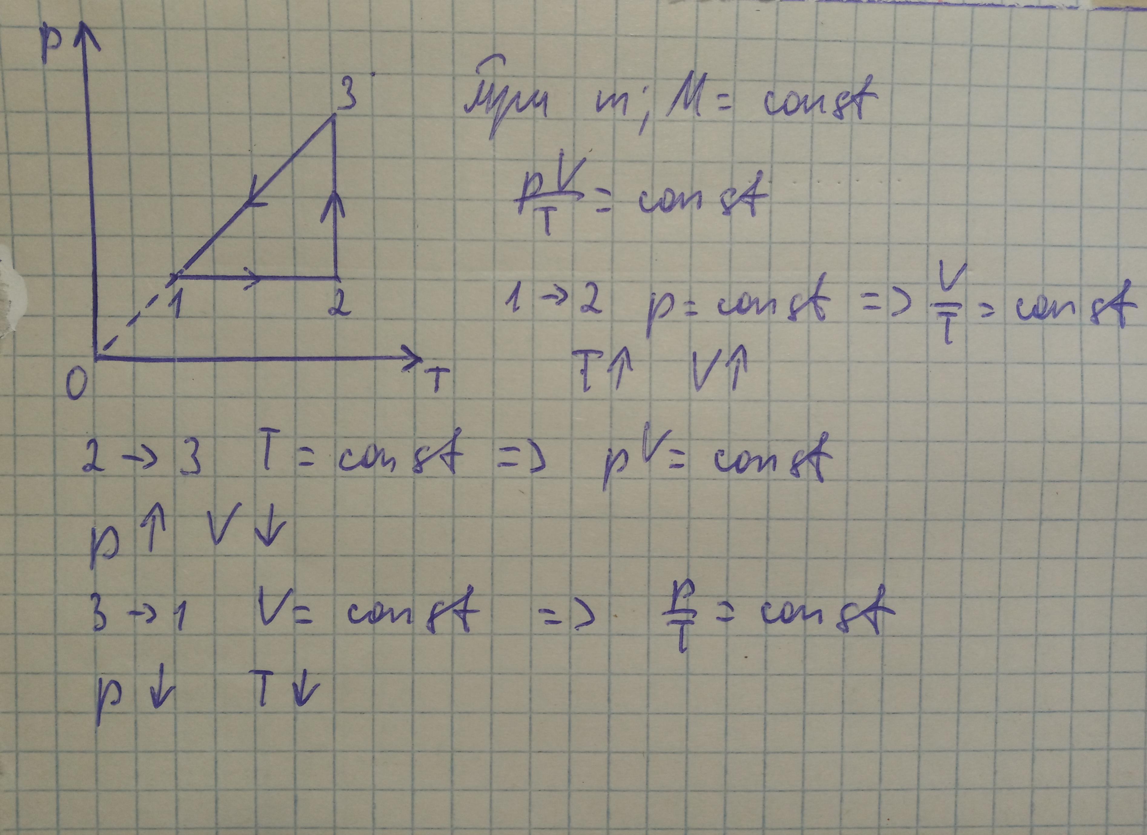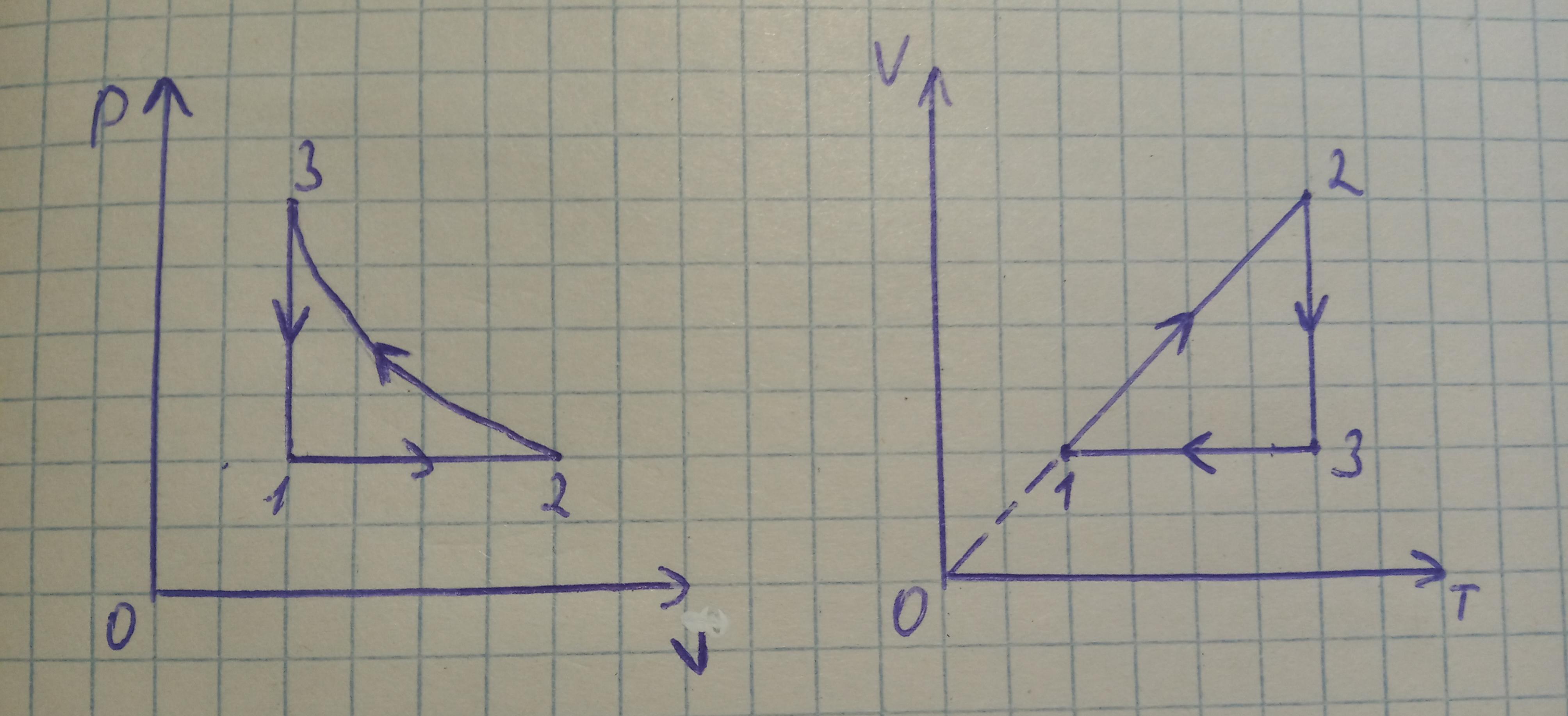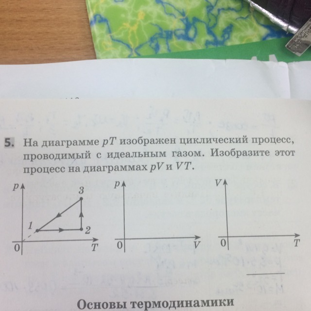 На диаграмме pT изображён циклический процесс, проводимый с идеальным газом. Изобразите этот процесс на диаграммах pV и VT.