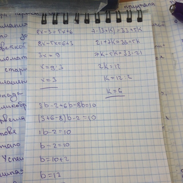 8х-3=5х+6 7*(3+к)=33+5к 3b-2+6b-8b=10