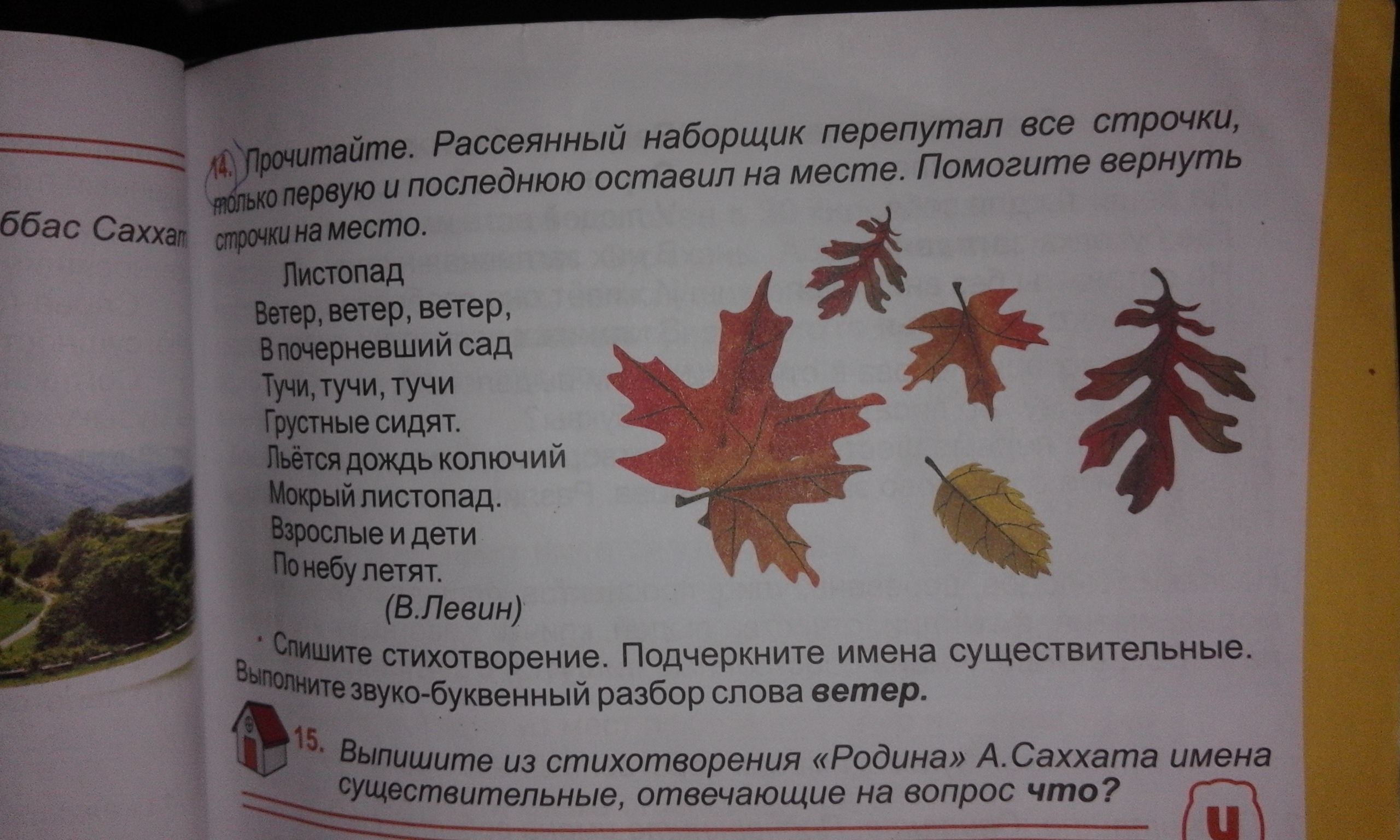 Имена существительные: листопад, ветер, дети, взрослые, дождь, сад, тучи, по небу.