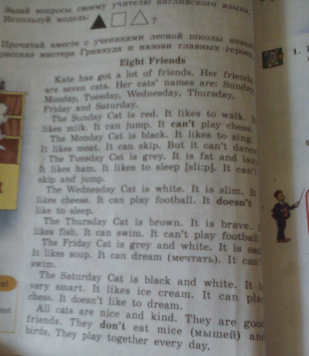 Котик-Четверг - коричневый. Он храбрый. Ему нравится рыба. Он может плавать. Он не может играть в футбол.