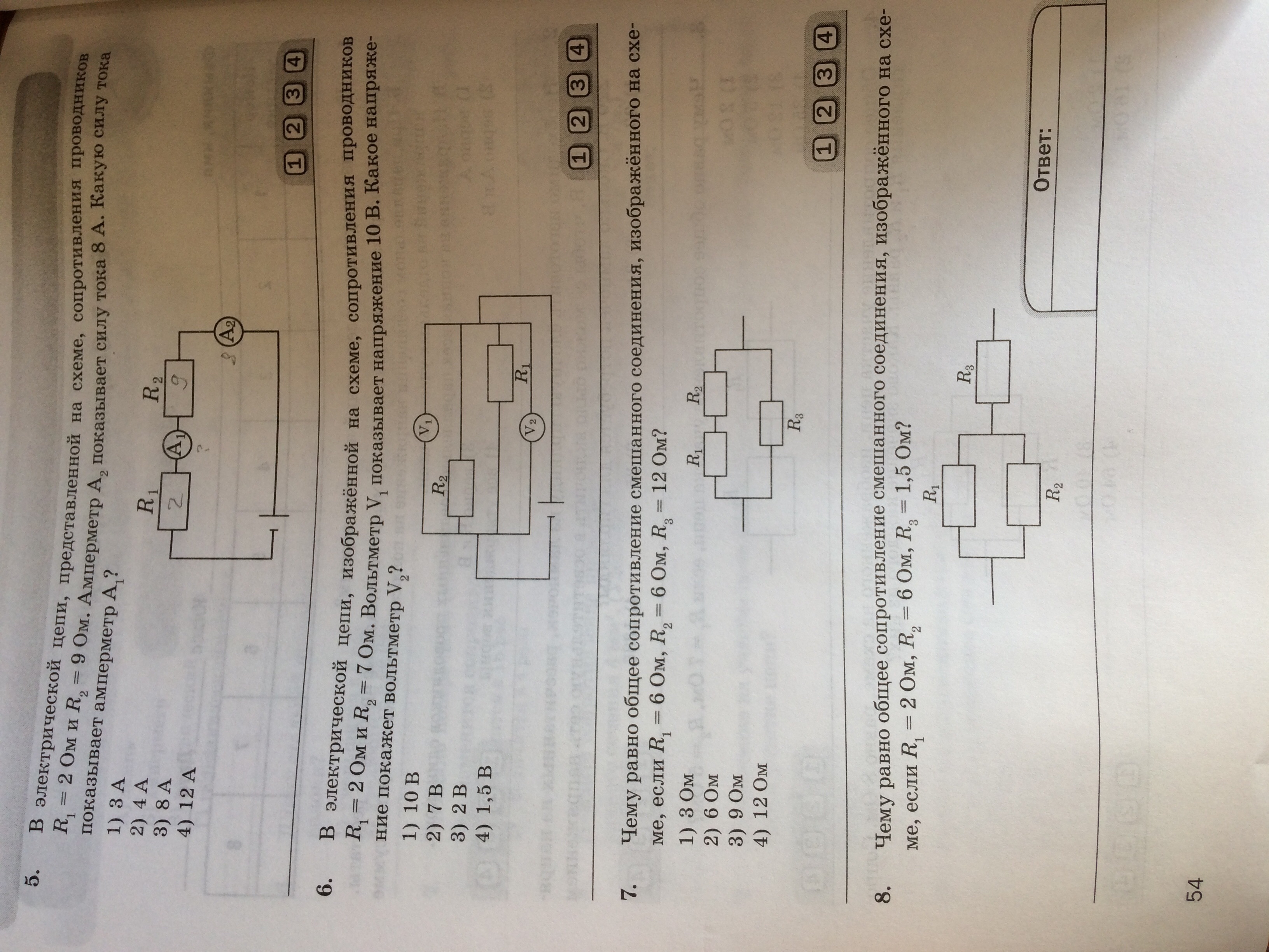 №6) В параллельно подключенных элементах, напряжение одинаково. => Напряжение на обоих вольтметрах одинаково => Вольтметр 2 покажет тоже самое, что и первый, т.е. 10В (1-й вариант)