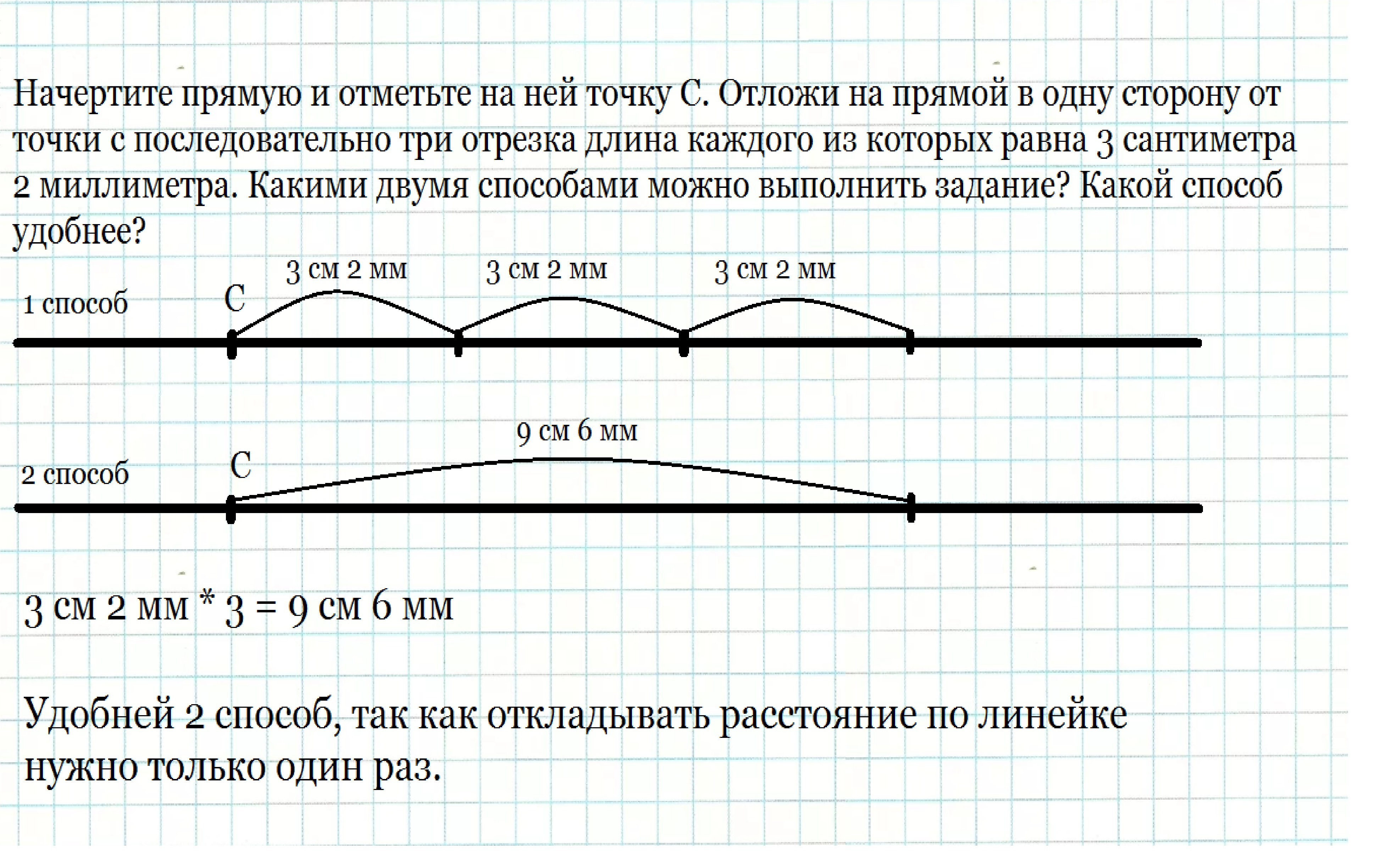 Начертите прямую и отметьте на ней точку C Отложи на прямой в одну сторону от точки с последовательно три отрезка длина каждого из которых равна 3 сантиметра 2 миллиметра какими двумя способами можно выполнить задание какой способ удобнее