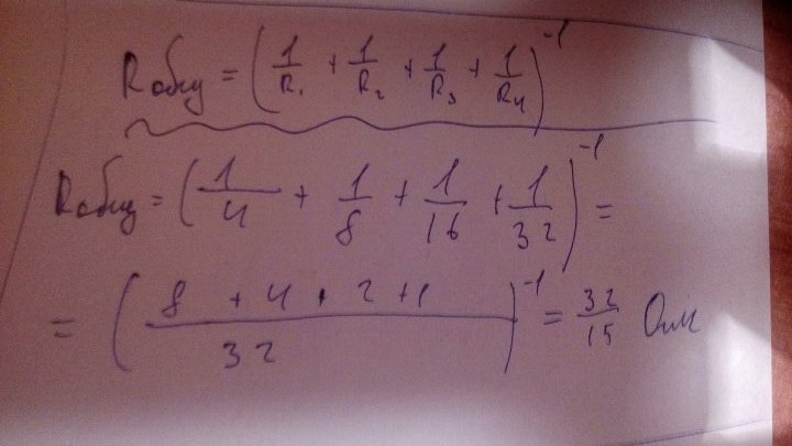 HELP! Четыре проводника с сопротивлением 4,8,16 и 32 ом соединены параллельно. Найти их общее сопротивление
