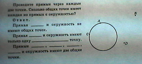 Решите пожалуйста! Проведите прямые через каждые две точки. Сколько общих точек имеет каждая из прямых с окружностью?