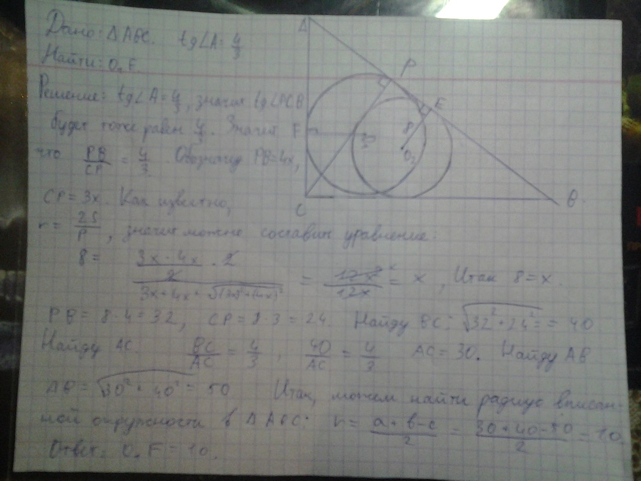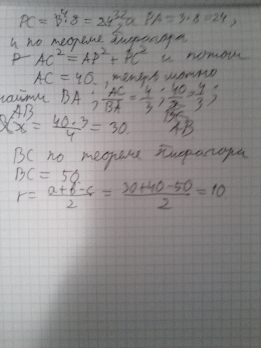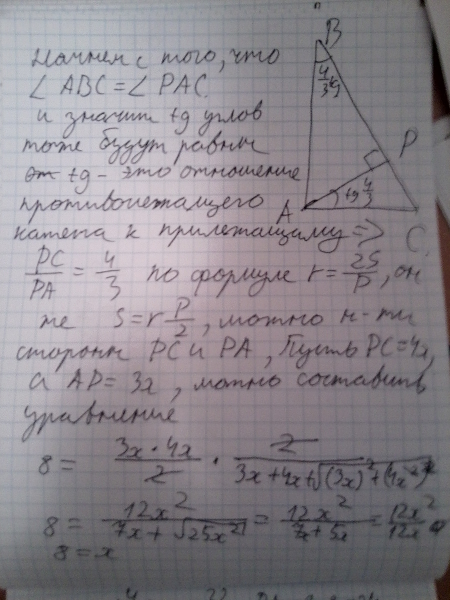 из вершины прямого угла С треугольника АВС проведена высота СР. Радиус окружности ,вписанной в треугольник ВСР ,равен 8, тангенс угла ВАС равен 4/3. Найти радиус вписанной окружности треугольника АВС.