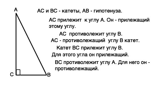 Другой катет лежит напротив того угла и называется противолежащим углу катетом. (см. рисунок)
