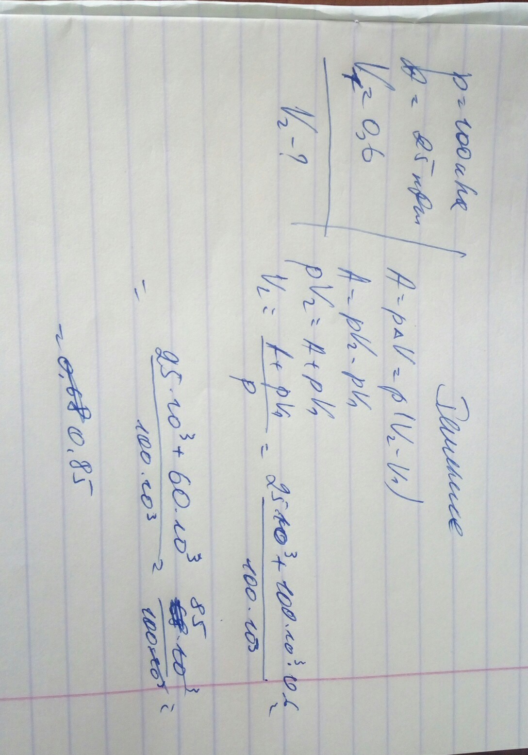 При постоянном давлении, равном 100кПа, газ расширился, совершив работу 25кДж. Каким стал объем газа, если до расширения он занимал 0,6 м^3?
