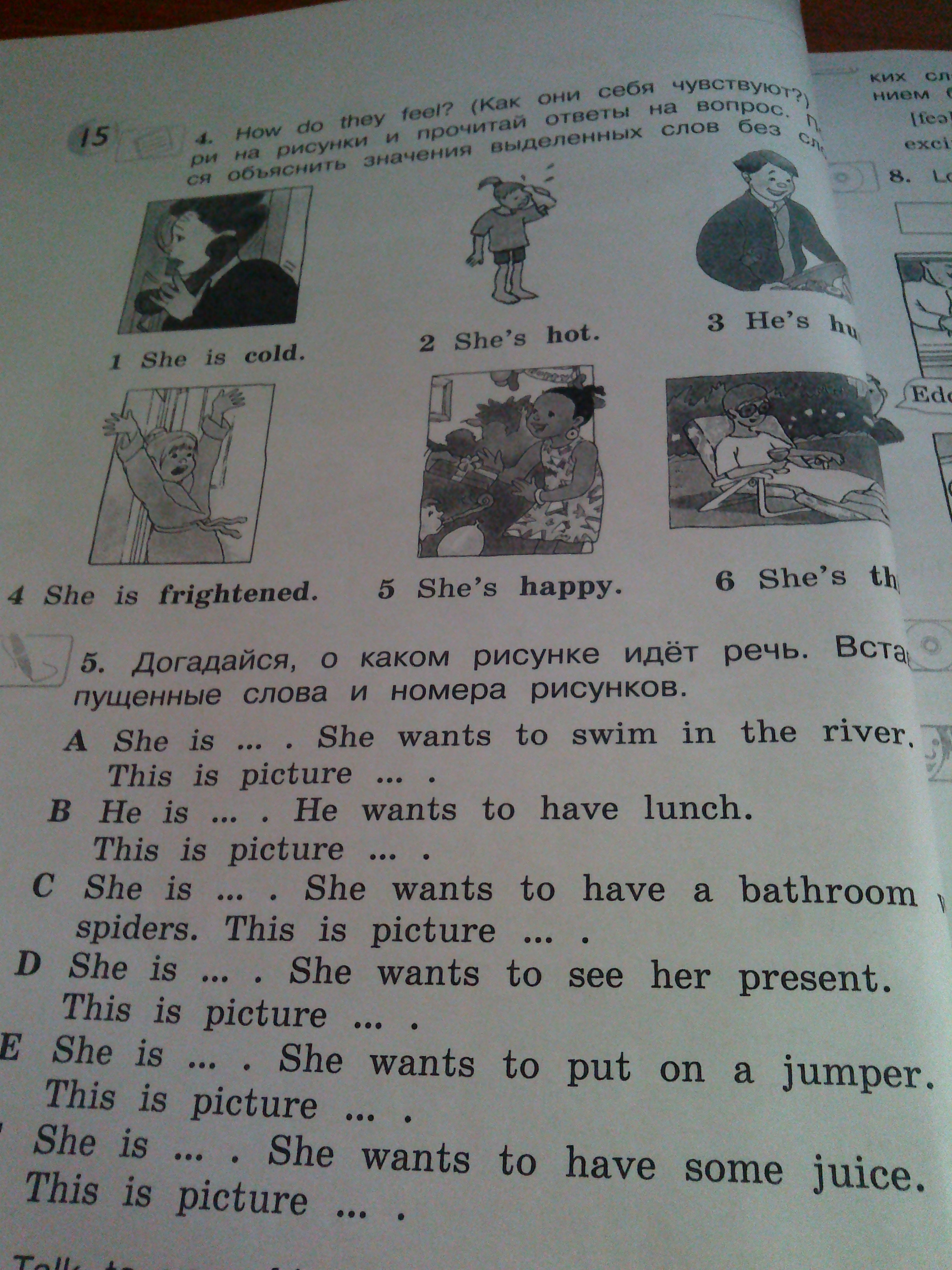1.she is ...( я не могу дочитать слово ). she wants to swim in the river . This is picture six.