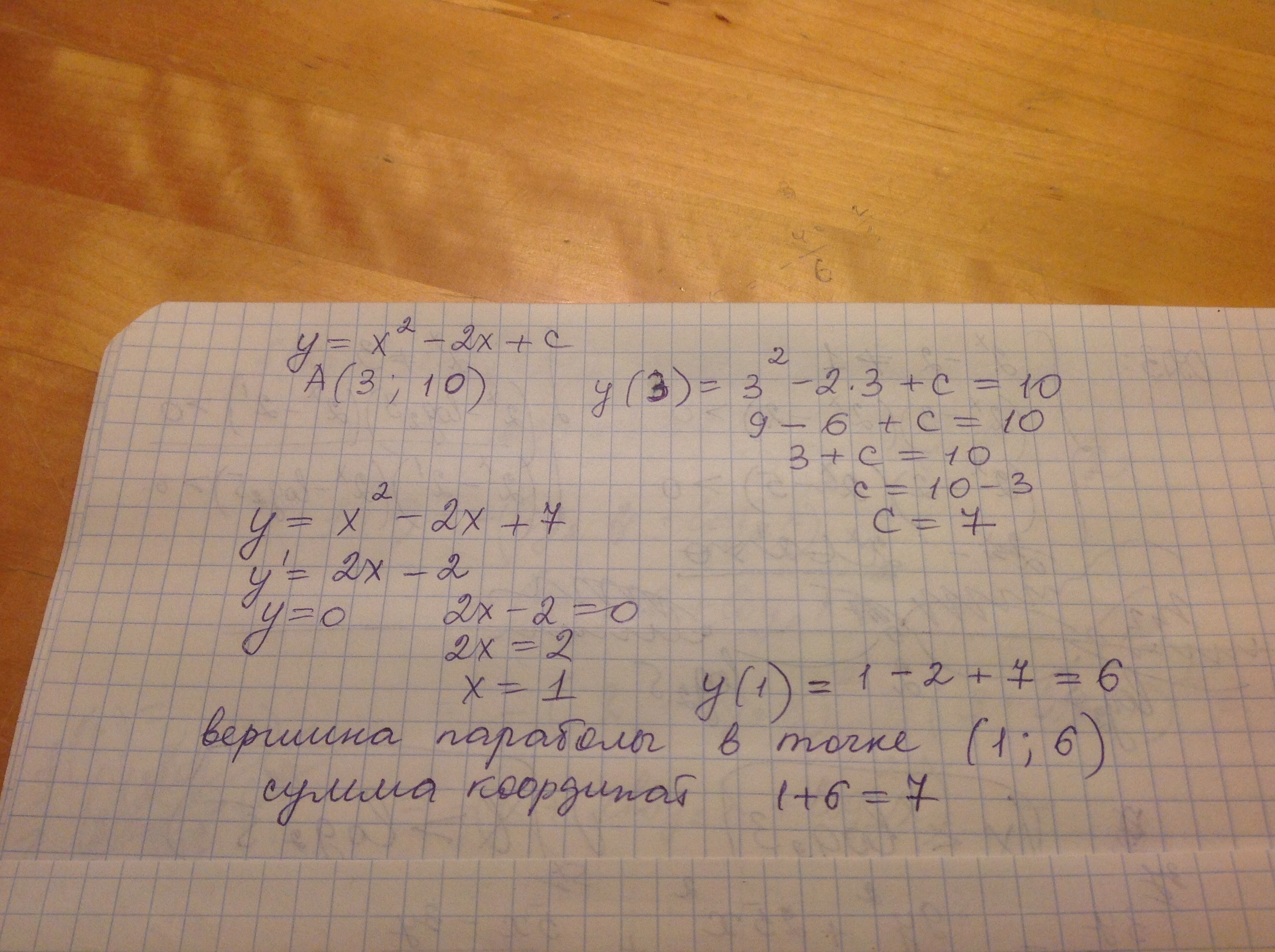 Найдите сумму координат вершины параболы y=x^2-2x+c, если она проходит через точку A(3;10).