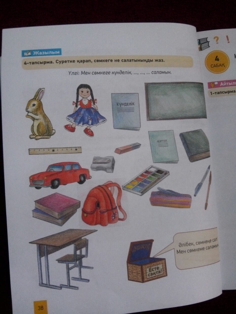 Мен сөмкеге күнделік,дəптер,сығыш,есте сақта,өшіргішті,кітаптарды,бояу заттарды жəне қалам мен қарындаш саламын