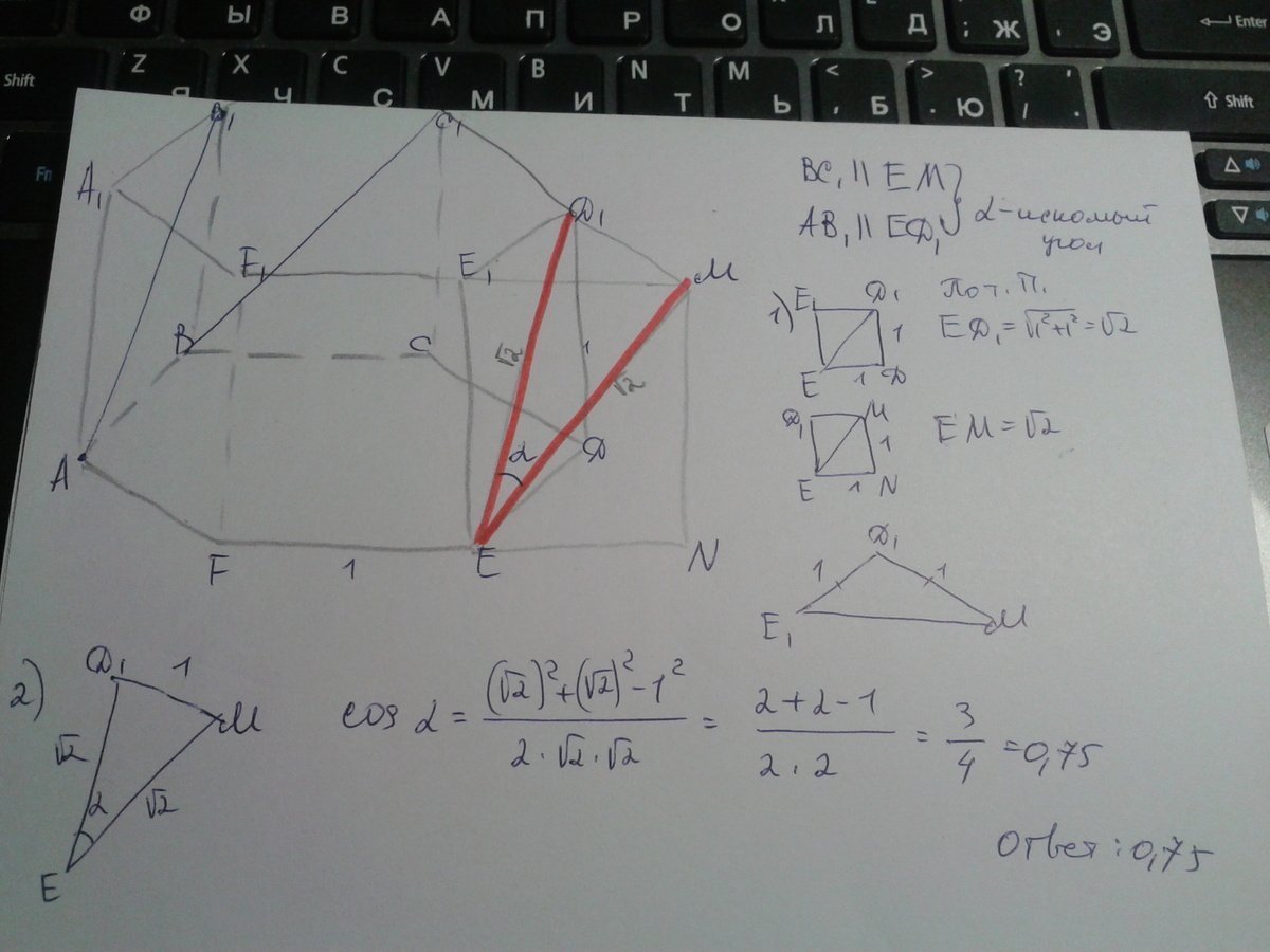 С2. В правильной шестиугольной призме ABCDEFA1B1C1D1E1F1, все ребра которой равны 1, найдите косинус угла между прямыми АВ1 и ВС1