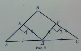 На рисунке 5 AD = DC; ED = DF ; угол 1 = углу 2 = 90 градусов. Докажите, что треугольник ABC равнобедренный