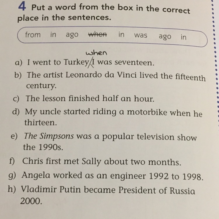 b) lived in the c) half an hour ago d) he was thirteen e) in the 1990s f) months ago g) from 1992 h) in 2000