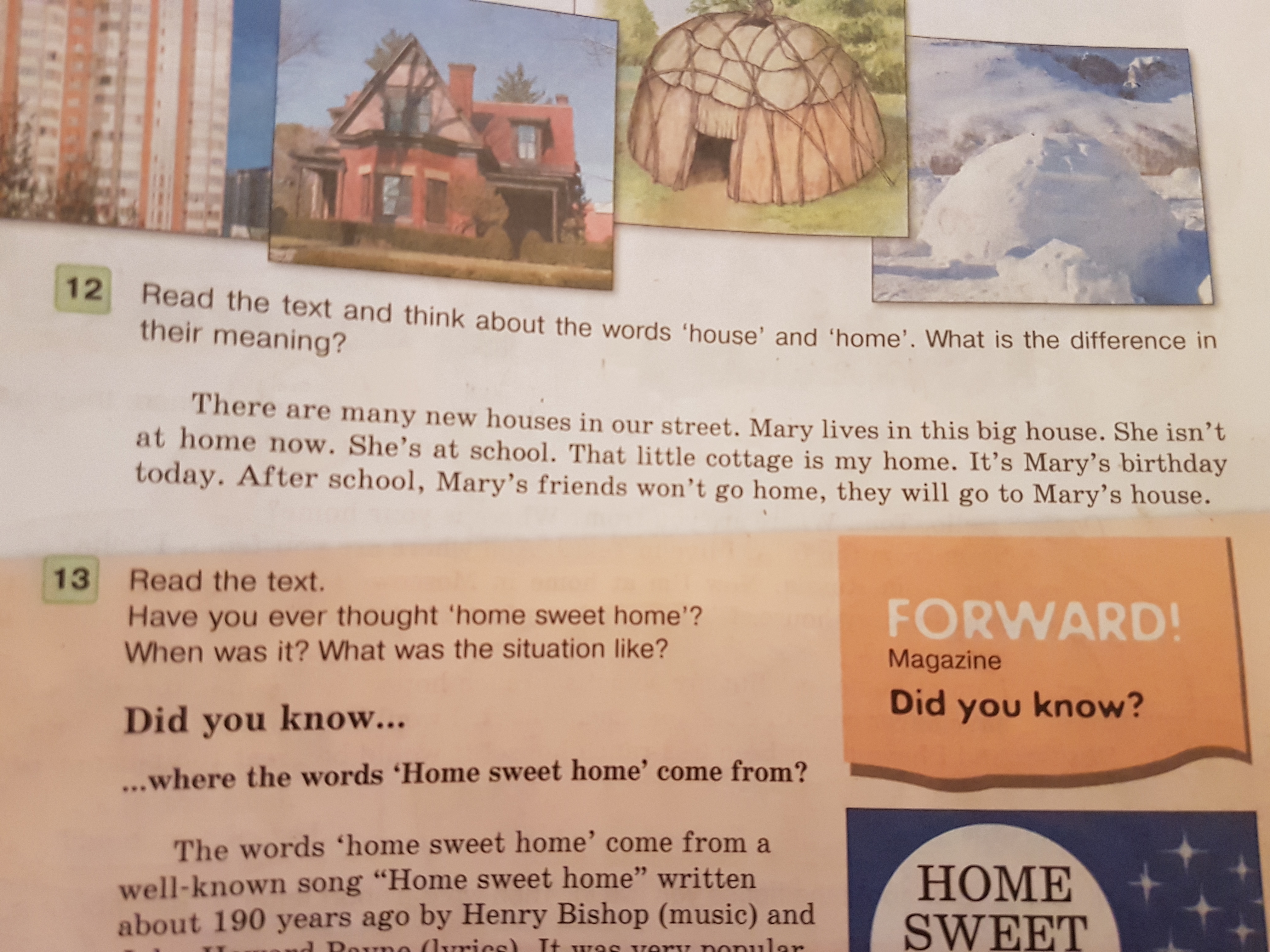 Этот маленький котедж мой дом. Сегодня у Мари день рождения. После школы друзья Мари идут домой, они пойдут домой к Мари.