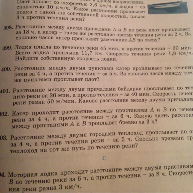 Номер 399. Помогите, пожалуйста, решить задачу, не надо решать уравнением, надо используя формулу на движение по реке. Спасибо!