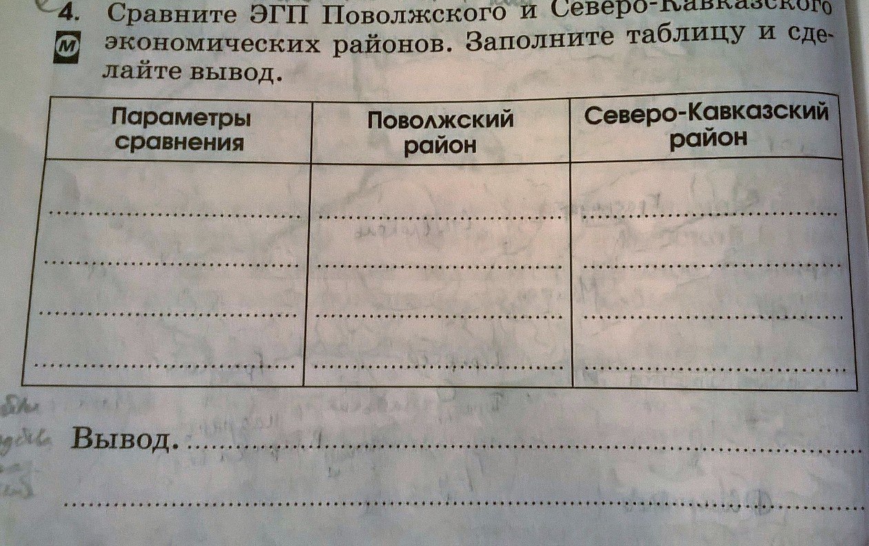 Сравните ЭГП(экономика географического положения) Поволжского и Северо-Кавказского экономических районов. Заполните таблицу и сделайте вывод ( в выводе написать черты сходства и различия).