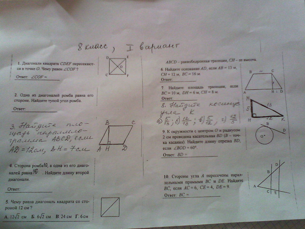 7)S=½(BC+AD)*CH; AD=10+6=16, значит S=½(10+16)*8=104