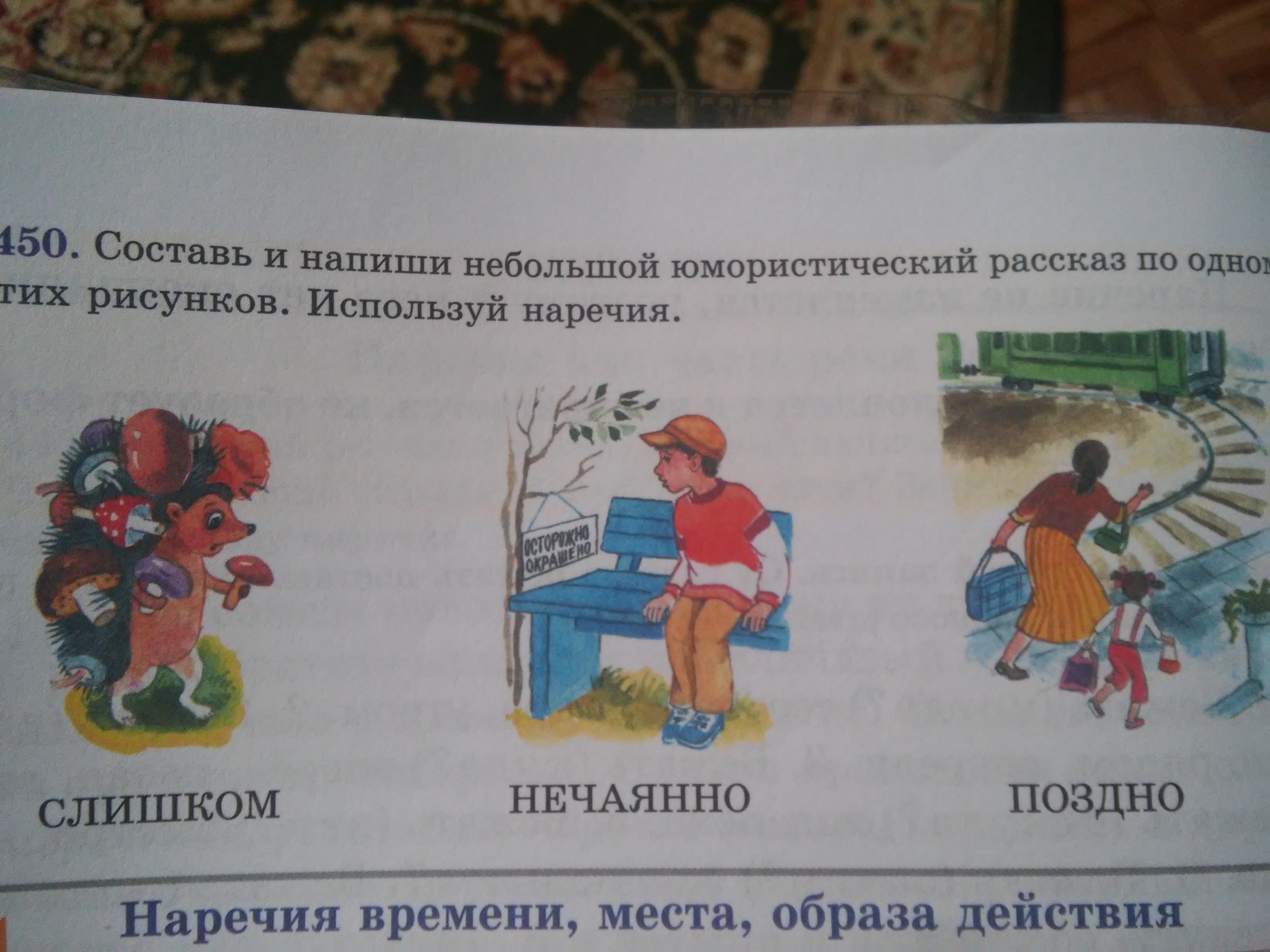Составь и напиши небольшой юмористический рассказ по одному из этих рисунков. Используй наречия.
