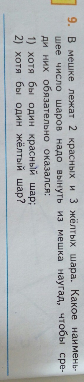 2) нужно вытянуть минимум 3 шара ( два могут быть красными, но один точно будет жёлтый)