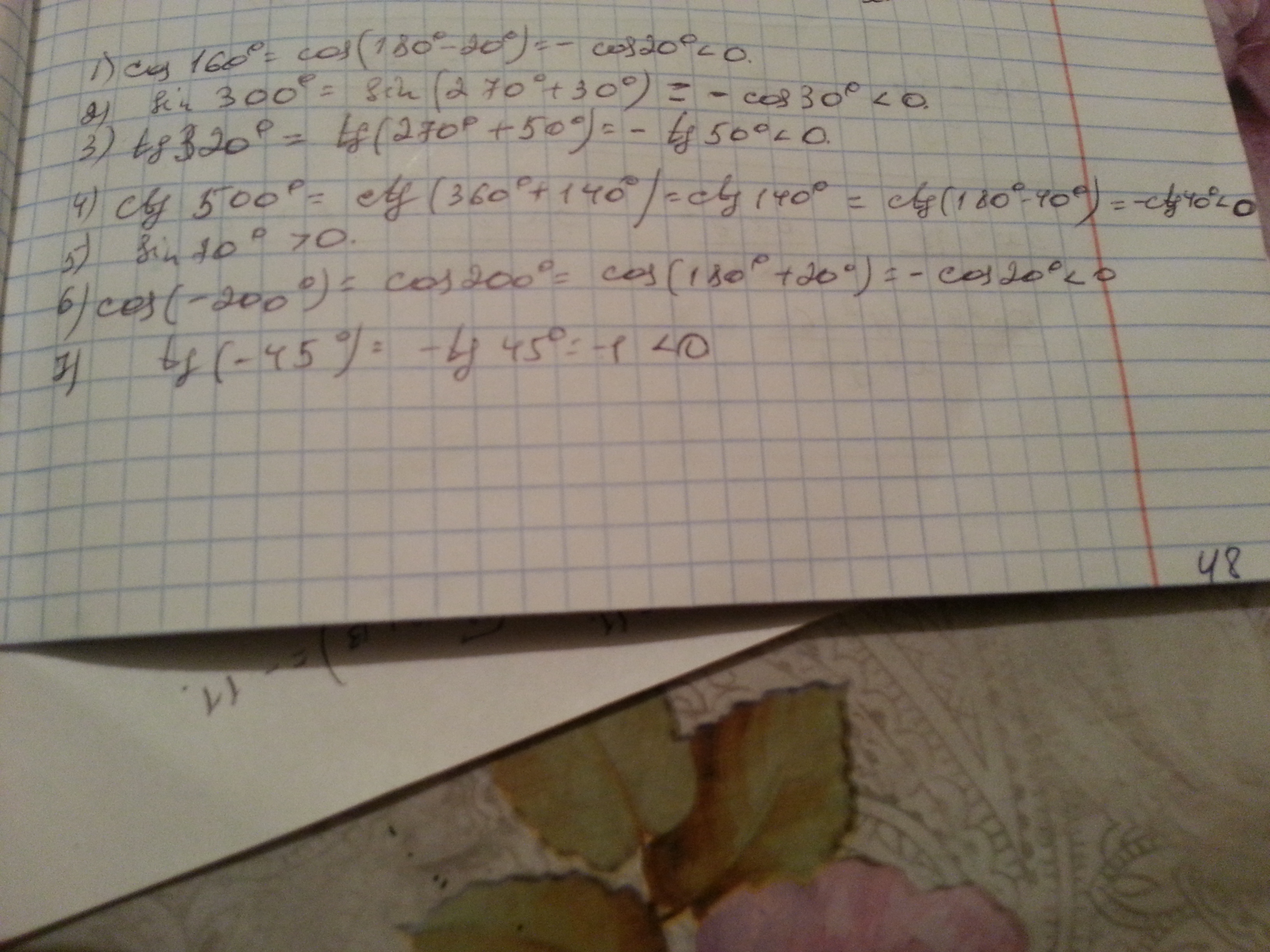 Какие знаки имеют: cos 160гр.; sin 300гр.; tg 320гр.; ctg 500гр.; sin 70гр.; cos (-200)гр.; tg (-45гр) Гр. - градус
