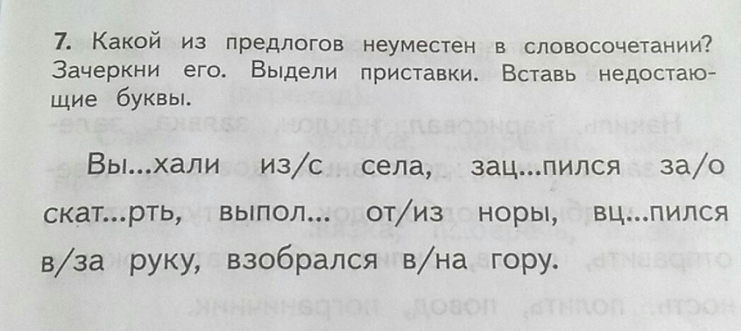 Выехали из села , зацепился за скатерть, выполз из норы, вцепился за руку , взобрался на гору;