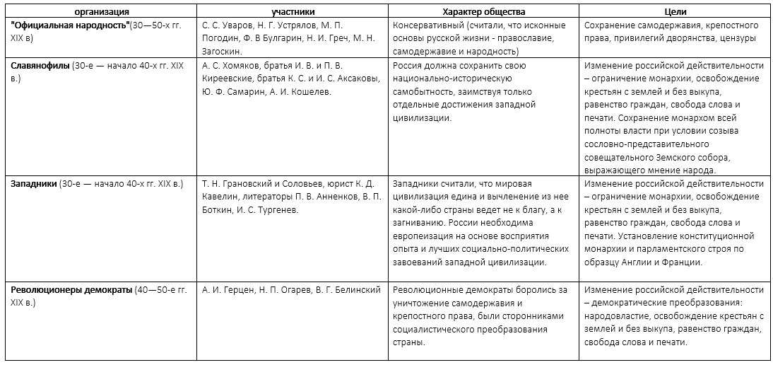 1 колонка-Организация,годы 2-Участники 3-Характер общества 4-Цели