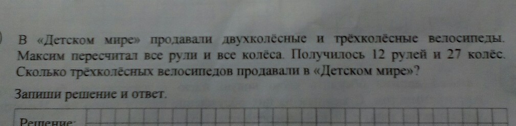 Пусть х- двухколесные, то у трехколёсные. Из условия задачи х+у= 12 , 2х+3у= 27. Подставляем первое выражение во второе х=12-у 2(12-у)+3у=27. 24-2у+3у=27. У=3 - а это трехколёсные велосипеды. Ответ 3 трехколёсных велосипеда продавали