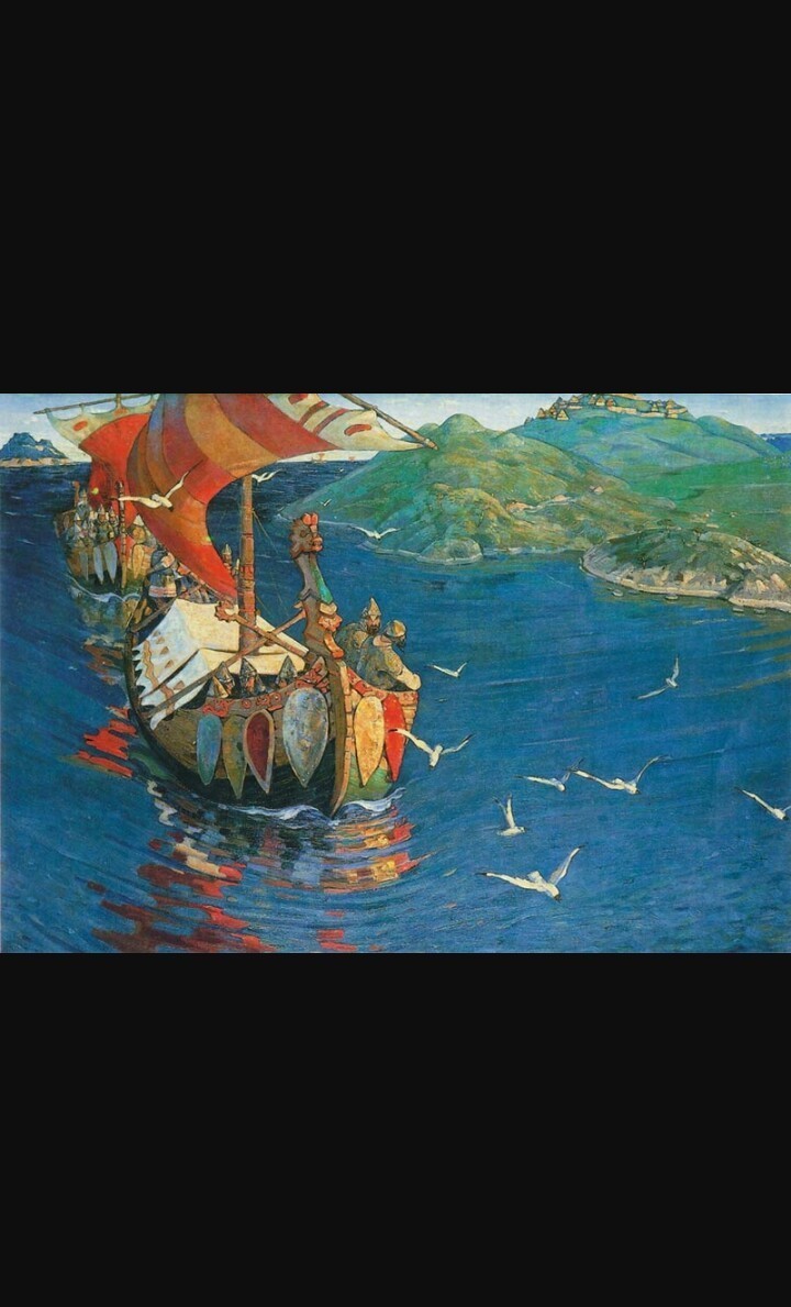 На берегу никого не видно. Лишь вдали мы видим небольшое поселение. Русских людей уже сложно чем-то удивить, ведь они привыкли к разным гостям, в том числе воинственным. Наши соотечественники всегда могли дать отпор недоброжелателям и отстоять свою независимость. Если же гости пришли с миром, то они встретят радушный прием. Думаю, что гости, изображенные на картине прибыли с мирными целями, не для вражды. Картина получилась очень яркой, художник использовал насыщенные краски, показывая и красоту природы, и кораблей. Лодка ярким пятном выделяется на фоне воды изумрудного цвета и приковывает к себе внимание, заставляя любоваться.