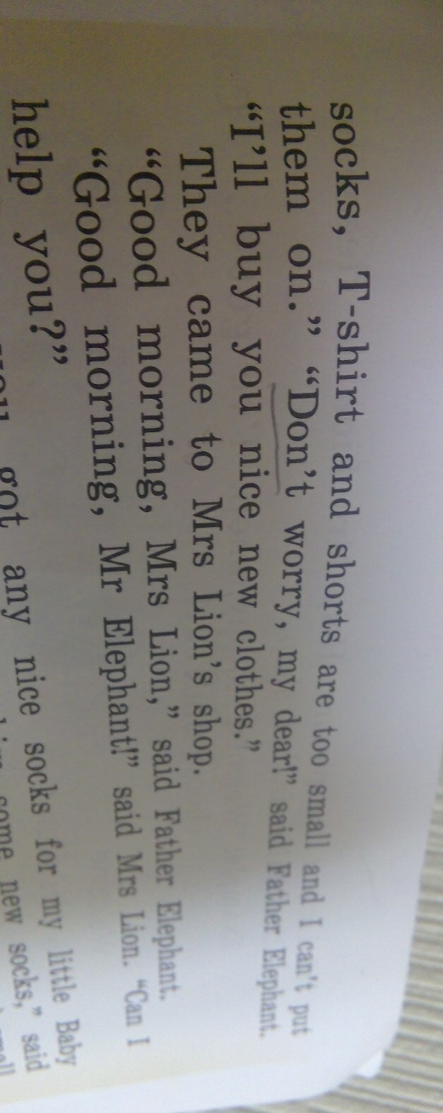 Но мои носки, футболка и шорты тоже маленькие и я не смогу надеть их."Не волнуйся мой дорогой"-сказал слон Папа."Я куплю тебе хорошую новую одежду".Они пошли в магазин Мисис Лион."Доброе утро,Мисис Лион"-сказал Папа слон."Доброе утро Мистер Слон "0сказала Мисис Лион."Могу я вам помочь?"