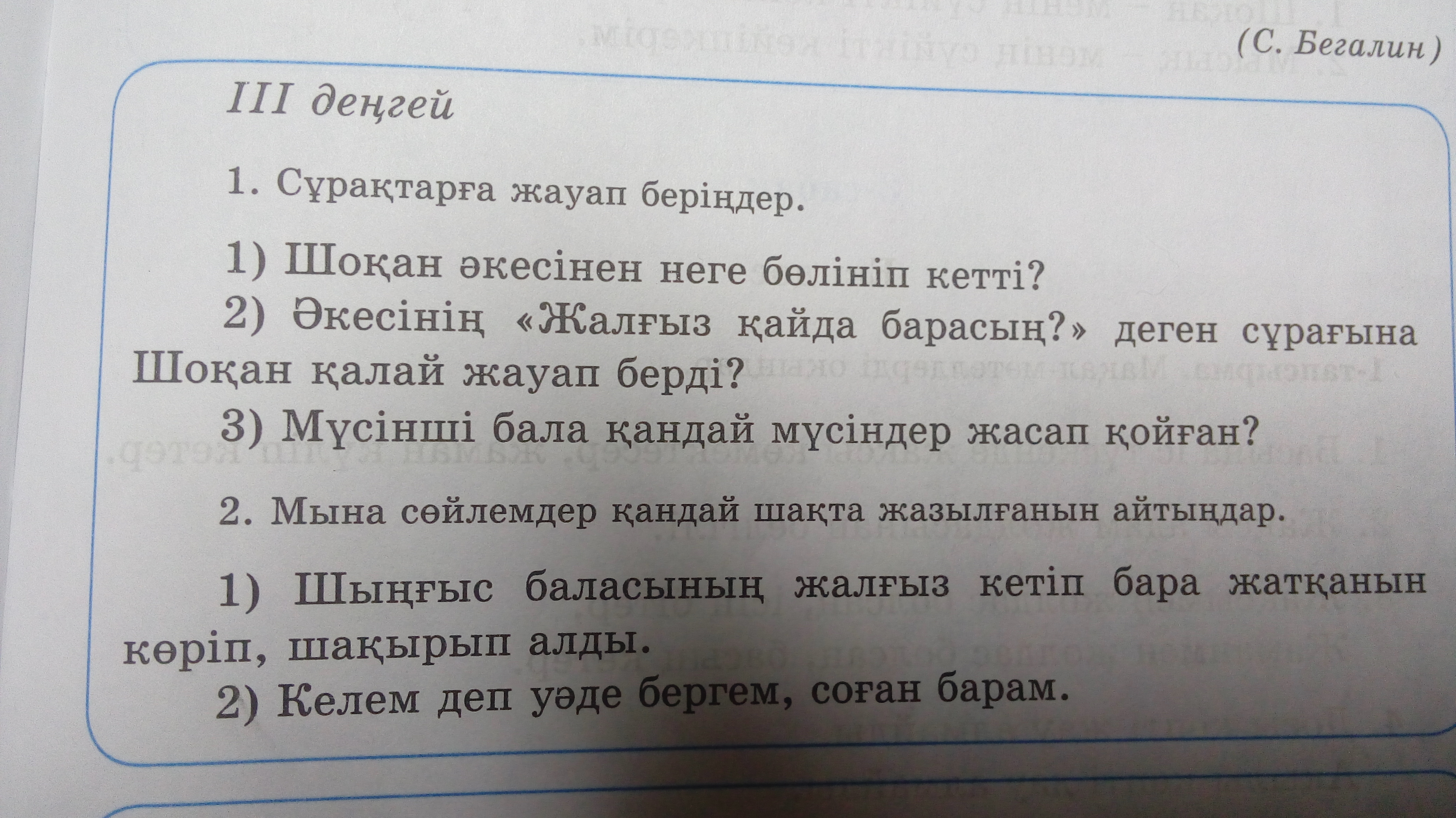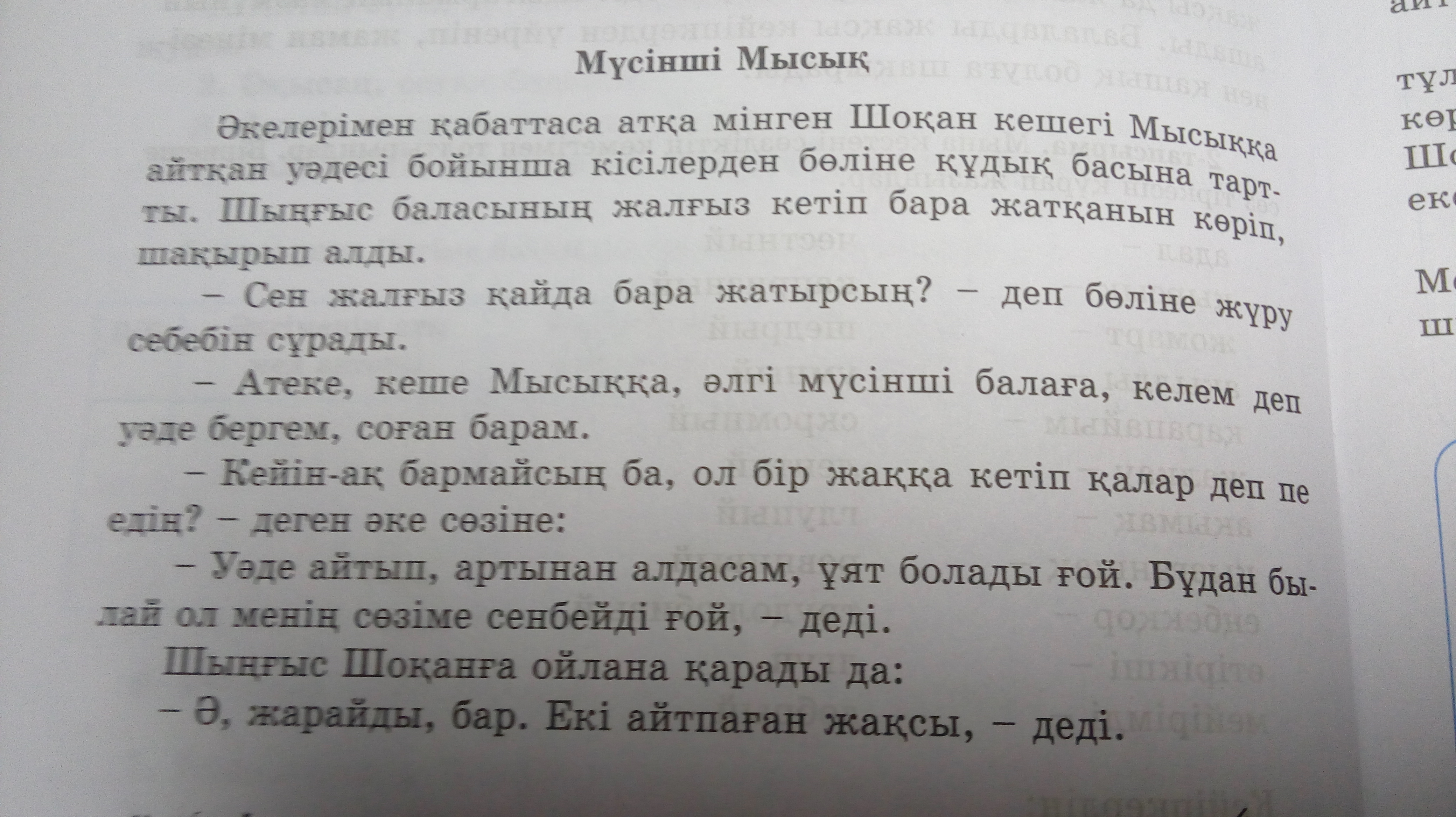 2) "Атеке, кеше Мысыққа, əлгі мүсінші балаға, келем деп уəде бергем, соған барам"- деп жауап берді.