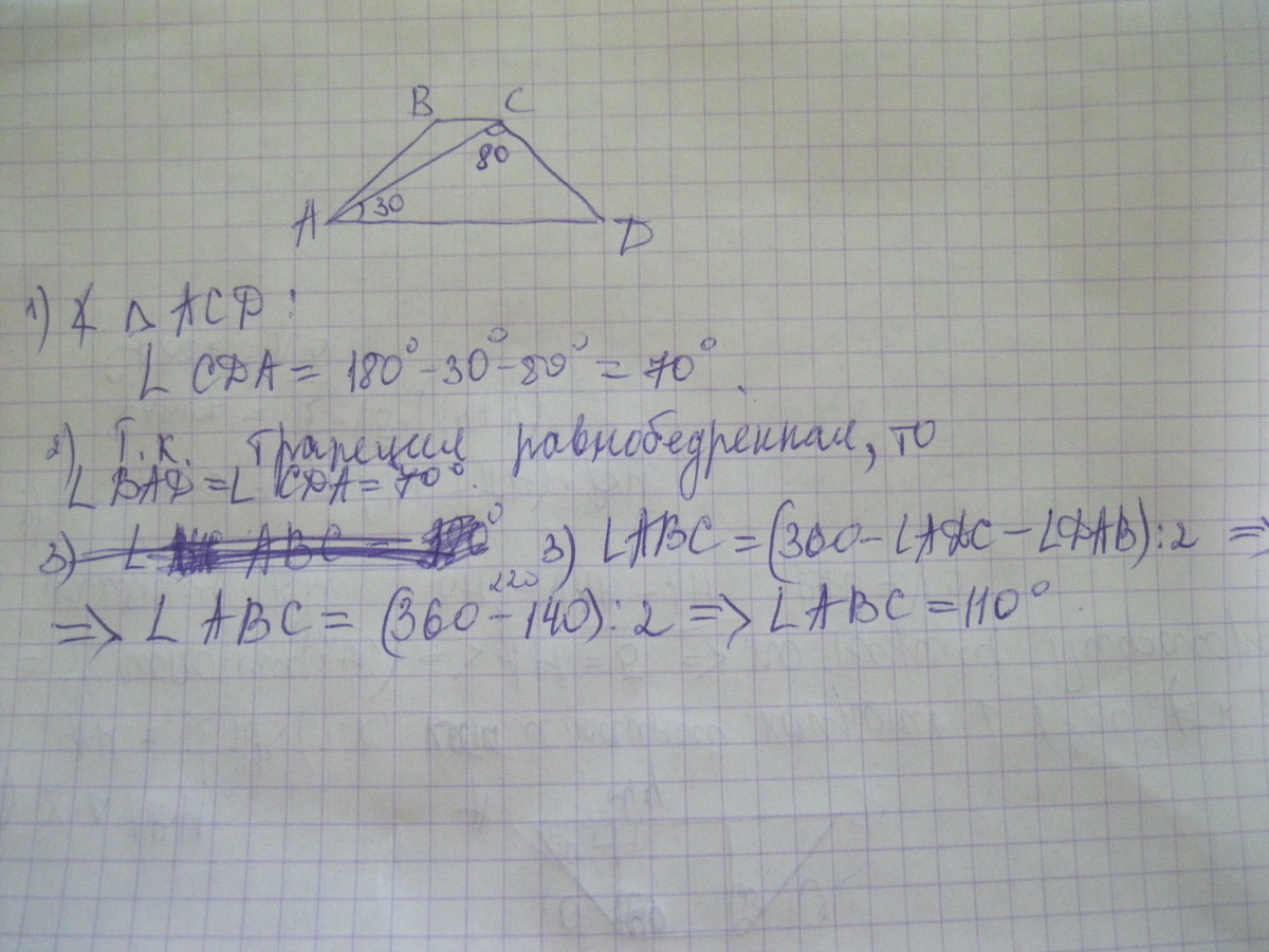 найдите угол ABC равнобедренной трапеции ABCD, если диагональ AC образует с основанием AD и боковой стороной CD углы, равные 30градусов и 80градусов соответственно.