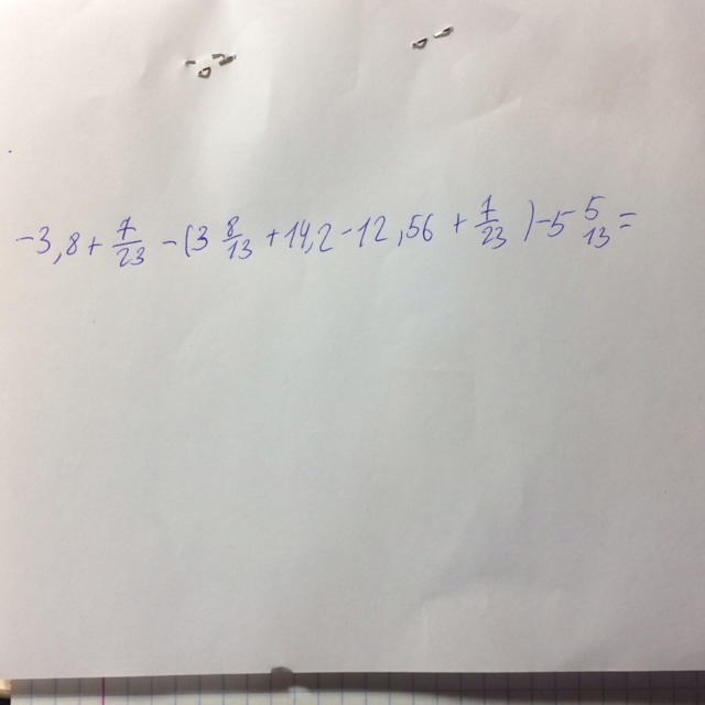 =-3,8 + 7/23 - 3 8/13 - 14,2 + 12,56 - 7/23 - 5 5/13 =-(3,8+14,2) - (3 8/13+5 5/13) +(7/23-7/23) +12,56= -18 - 9 + 12,56 =-27 + 12,56 = -14,44