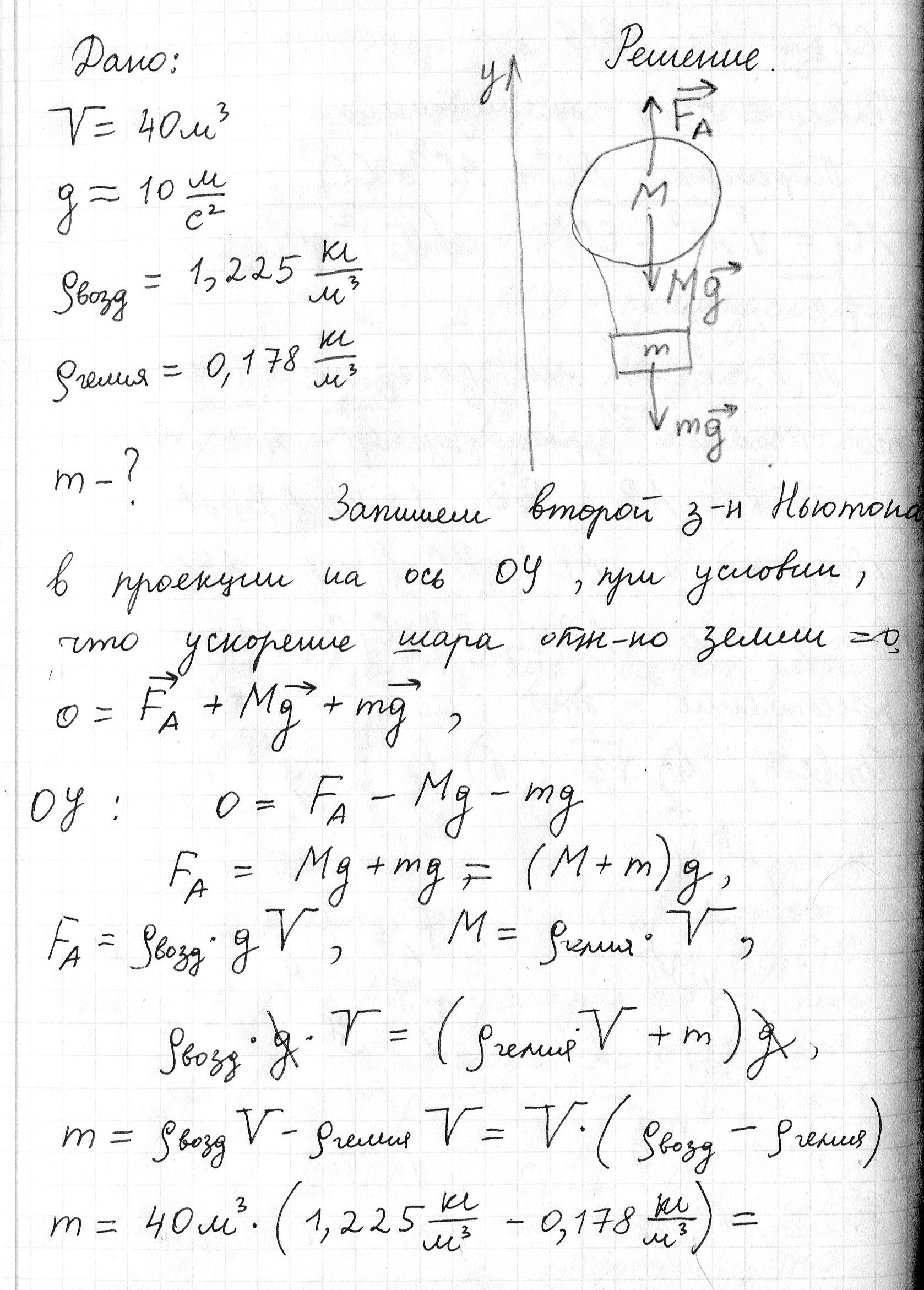 Плотности воздуха и гелия я взял из справочника - это для средних классов сойдет. Для старших классов - плотности воздуха и гелия можно рассчитать отдельно, зная молярную массу воздуха, гелия, атмосферное давление и температуру окружающего воздуха. Решение на прикрепленных изображениях ниже.