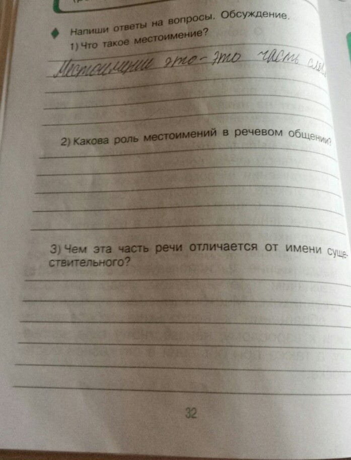 1.Местоиме́ние (лат. pronomen) — часть речи, которая указывает на предметы, признаки, количество, но не называет их. 2.Оно широко используется в устной речи. В письменной же речи местоимение я имеет ограничения в своем употреблении: оно наиболее уместно в текстах художественной литературы, в таких жанрах публицистики, как очерк, репортаж, полемические заметки, интервью, т. е. там, где употребление этого местоимения носит подчеркнуто личностный характер.3.Различие от существительного состоит в том, что местоимение указывает на предмет, но не называет их.