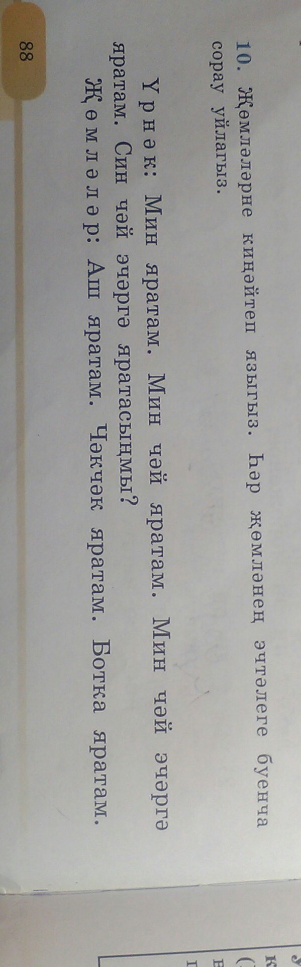 1.Мин яратам. Мин аш яратам. Мин аш ашарга яратам. Син аш ашарга яратасыңмы? 2. Мин яратам. Мин чәкчәк яратам. Мин чәкчәк ашарга яратам. Син чәкчәк ашарга яратасыңмы? 3. Мин яратам. Мин ботка яратам. Мин ботка ашарга яратам. Син ботка ашарга яратасыңмы?