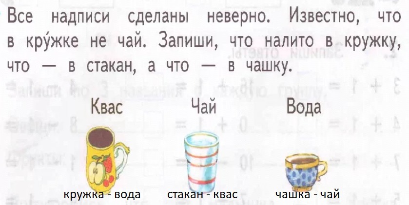 Все надписи сделаны неверно. Известно, что в кружке не чай. Записи, что налито в кружку, что - в стакан, а что - в чашку