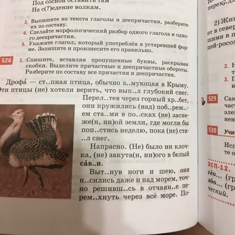 Причастные обороты: обычно зимующая в Крыму; не закутанного в белый саван;