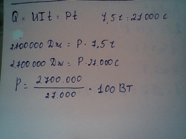 Электрическая лампочка за 7,5 час работы выделяет 2700 кДж теплоты. Определите мощность лампочки.