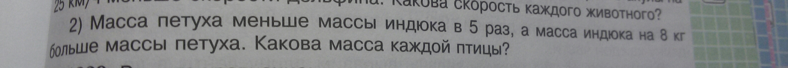 Предположим, что масса петуха х кг, тогда 5х кг масса индюка, также из условия задачи известно, что масса индюка на 8 кг больше массы петуха, а именно (х+8) кг
