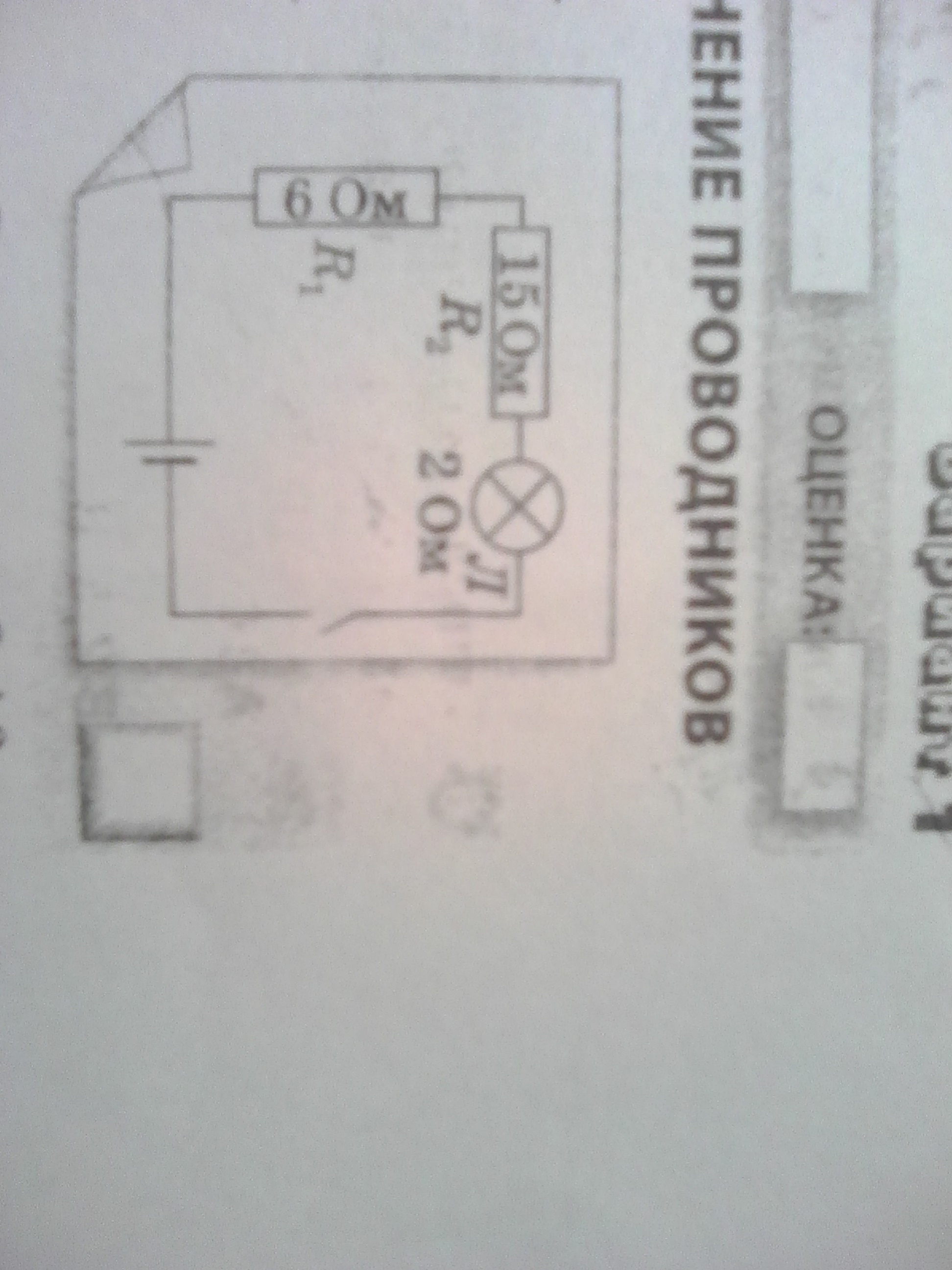 На резисторе R2(См. рисунок) напряжение равно 30 В, на лампе - 4 В , а на участке включающем все три проводника- 46 В. Определите напряжение на резиcторе R1