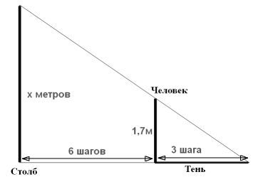 Человек ростом 1,7 м стоит на расстоянии 6 шагов от столба на котором расположен фонарь. Тень человека равна 3 шагам. На какой высоте (в метрах) расположен фонарь?