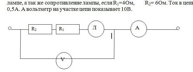 По схеме приведенной ниже, определите напряжение на каждом резисторе и лампе, а так же сопротивление лампы, если R1=4Ом, R2= 6Ом. Ток в цепи равен 0,5А. А вольтметр на участке цепи показывает 10В. ПОМОГИТЕ)