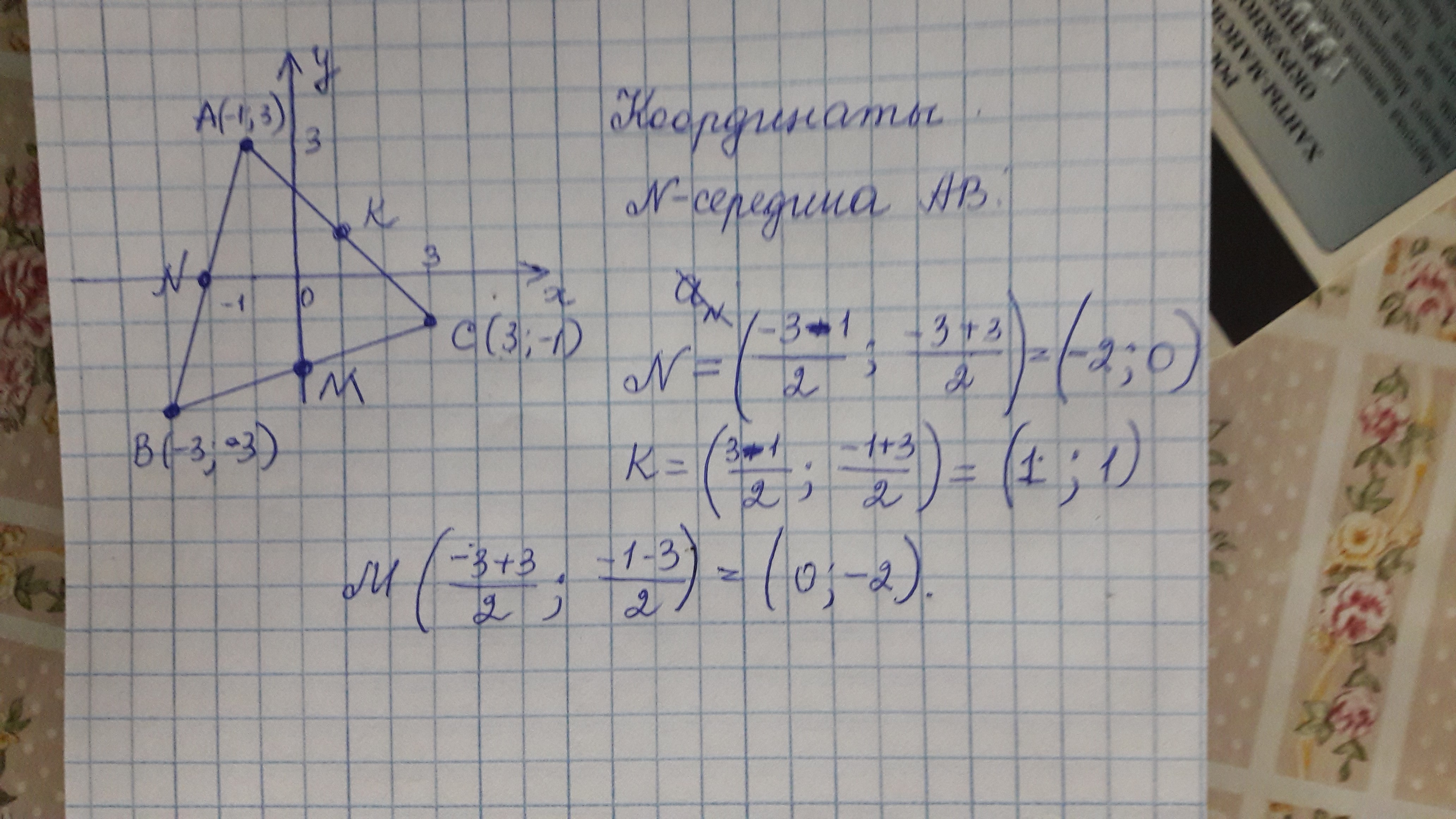 Люди, срочно срочно пресрочно, дали дз а я вообще не врубаюсь что как и почему. Кто-нибудь дайте ответ. Вот задание:Даны вершины треугольника А (-1;3) ВС (-3;-3) С (3;-1) Найдите координаты середины сторон треугольника. Как это делать, помогите.(