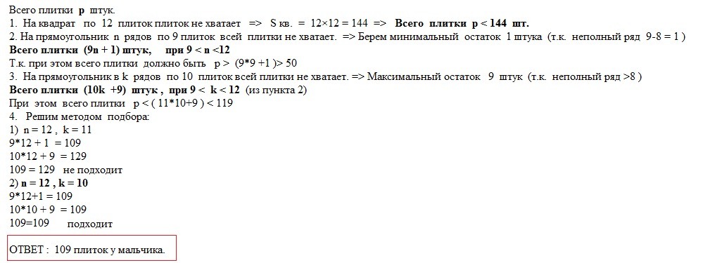 мальчик хочет на стене дома выложить мозаику прямоугольной формы из разноцветных квадратных плиток Есть ли укладывать в ряд по 12 плиток для квадратной мозаики плиток не хватает а при укладывании по 9 плиток в ряд остается один неполный ряд а 10 тоже не полный ряд в котором на 8 кг больше чем неполном ряду при укладывании по 9 плиток сколько всего плиток у мальчика если их больше 50
