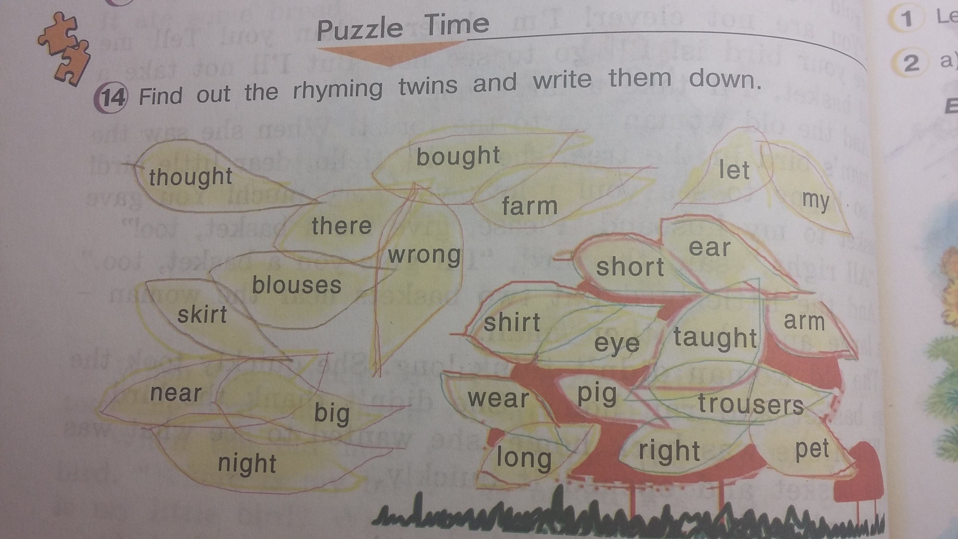 Trousers blouses, there wear, farm arm , pet let, big pig, eye my , wrong long, thought bought, ear near, skirt shirt , right night,