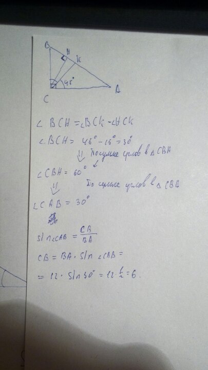 В прямоугольном треугольнике АВС угол между биссектрисой СК и высотой СН, проведенными из вершины прямого угла С, равен 15°. Сторона АВ=12см. Найдите сторону ВС, если известно, что точка К лежит между А и Н.