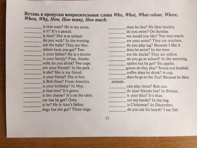 Вставь в пропуски вопросительные слова Who,What, What colour, Where, When,Why,How, How many, How Much