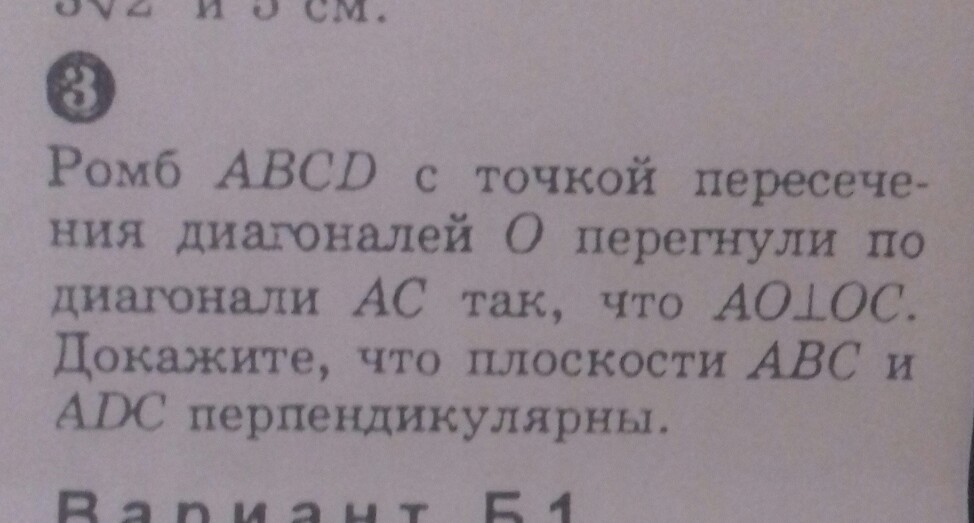 Имеется ввиду перегнуть не вдоль АС, а поперек. После перегиба получаются плоскости ABD и CBD, которые перпендикулярны (одна другой). Пересекаются по прямой BD.