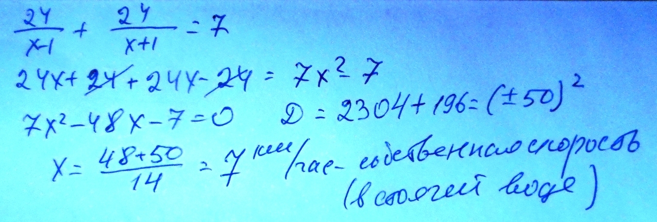 Моторная лодка за 7 часов проплыла 24 км против течения и вернулась обратно. Найди скорость моторной лодки в стоячей воде, если скорость течения реки равна 1 км/ч. пожалуйста поскорее